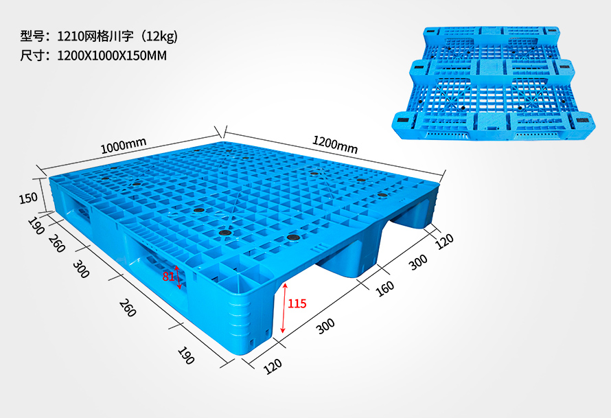 1210網(wǎng)格川字托盤 | 1200*1000*150/165 | 10/11/11.5/12/13.5/14.5 | 1.5T | 5T | 8/10 |
